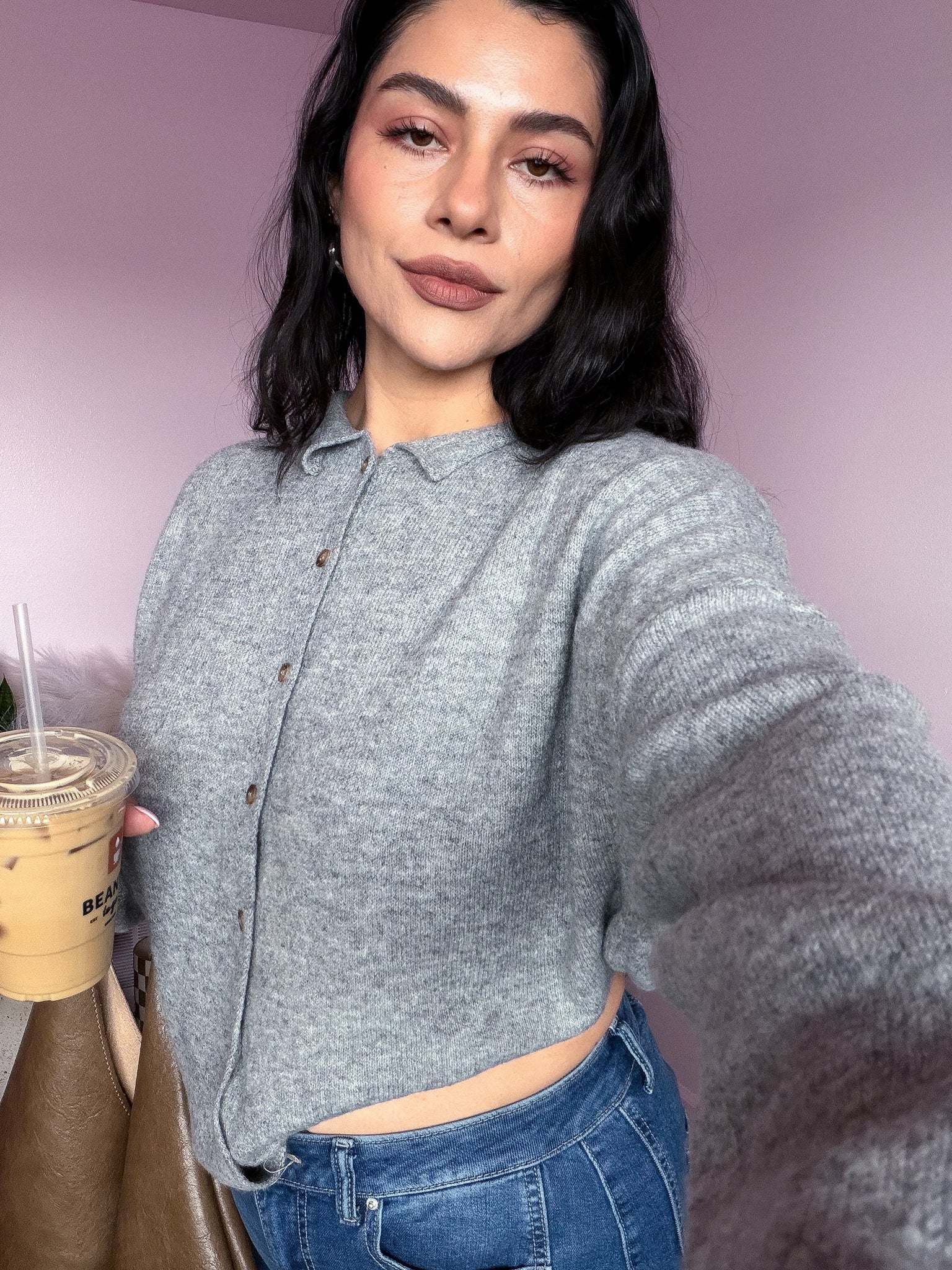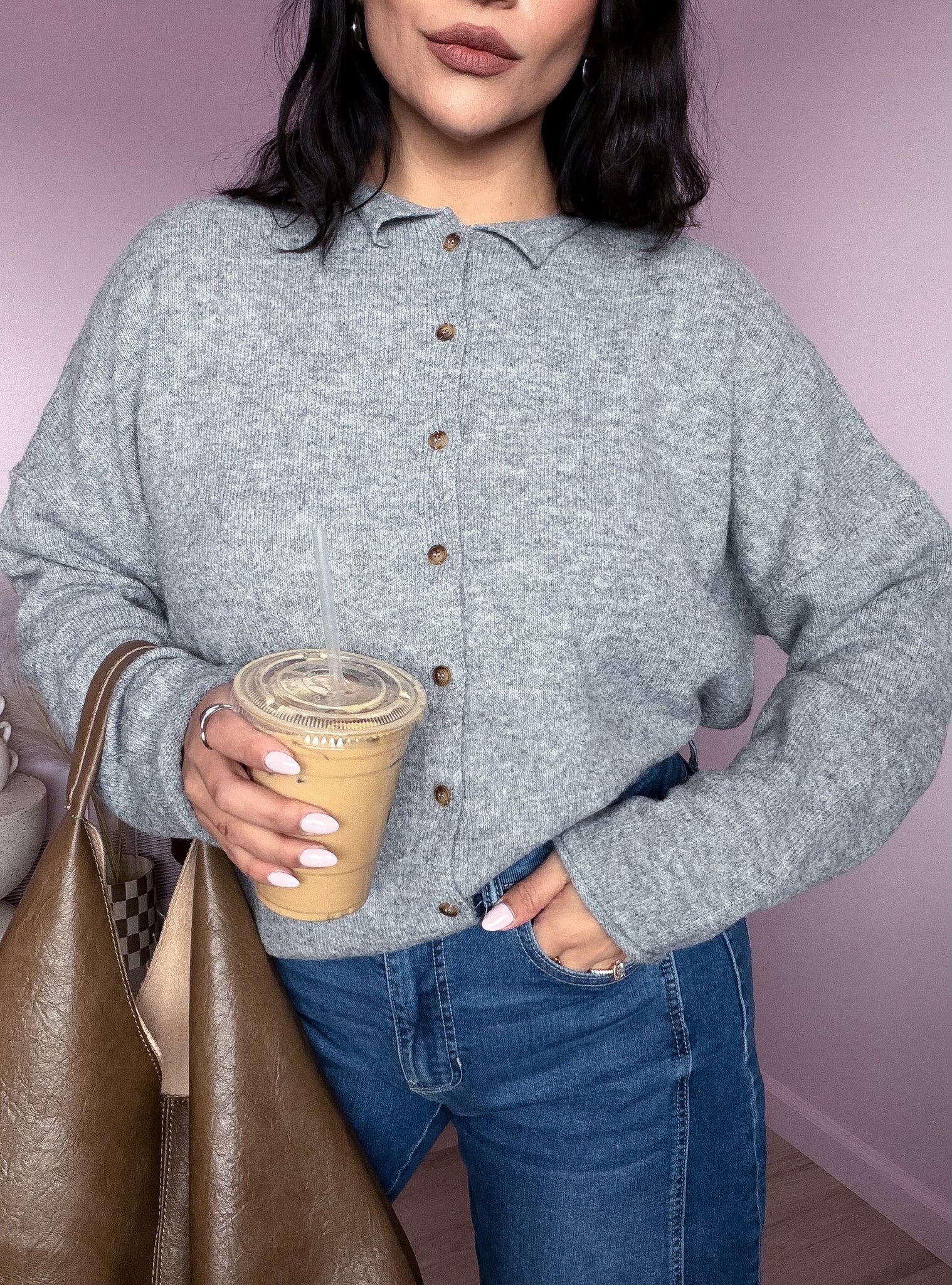 Lightweight cardigan featuring brown buttons with raw collar & cuffs. It’s super soft material.