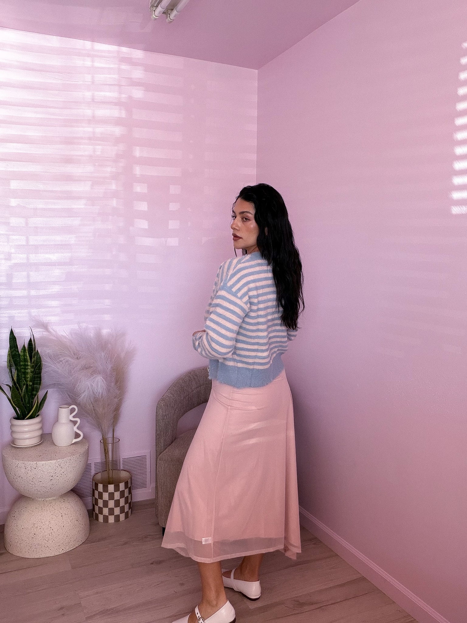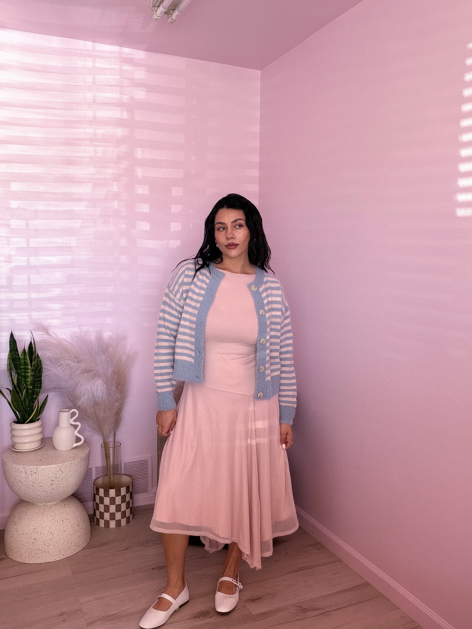 Evelia is 5’4, 40D & is wearing a size M, she’s usually a size M in dresses.