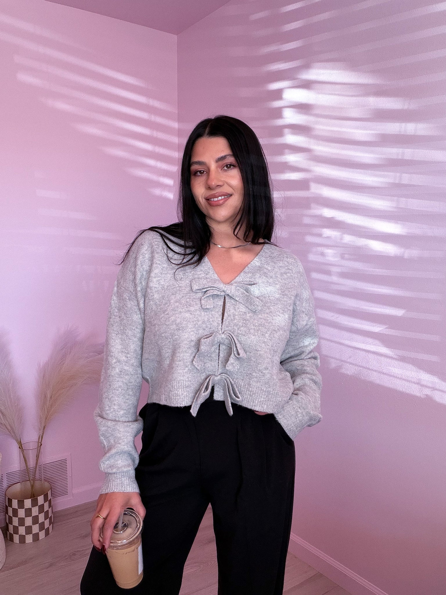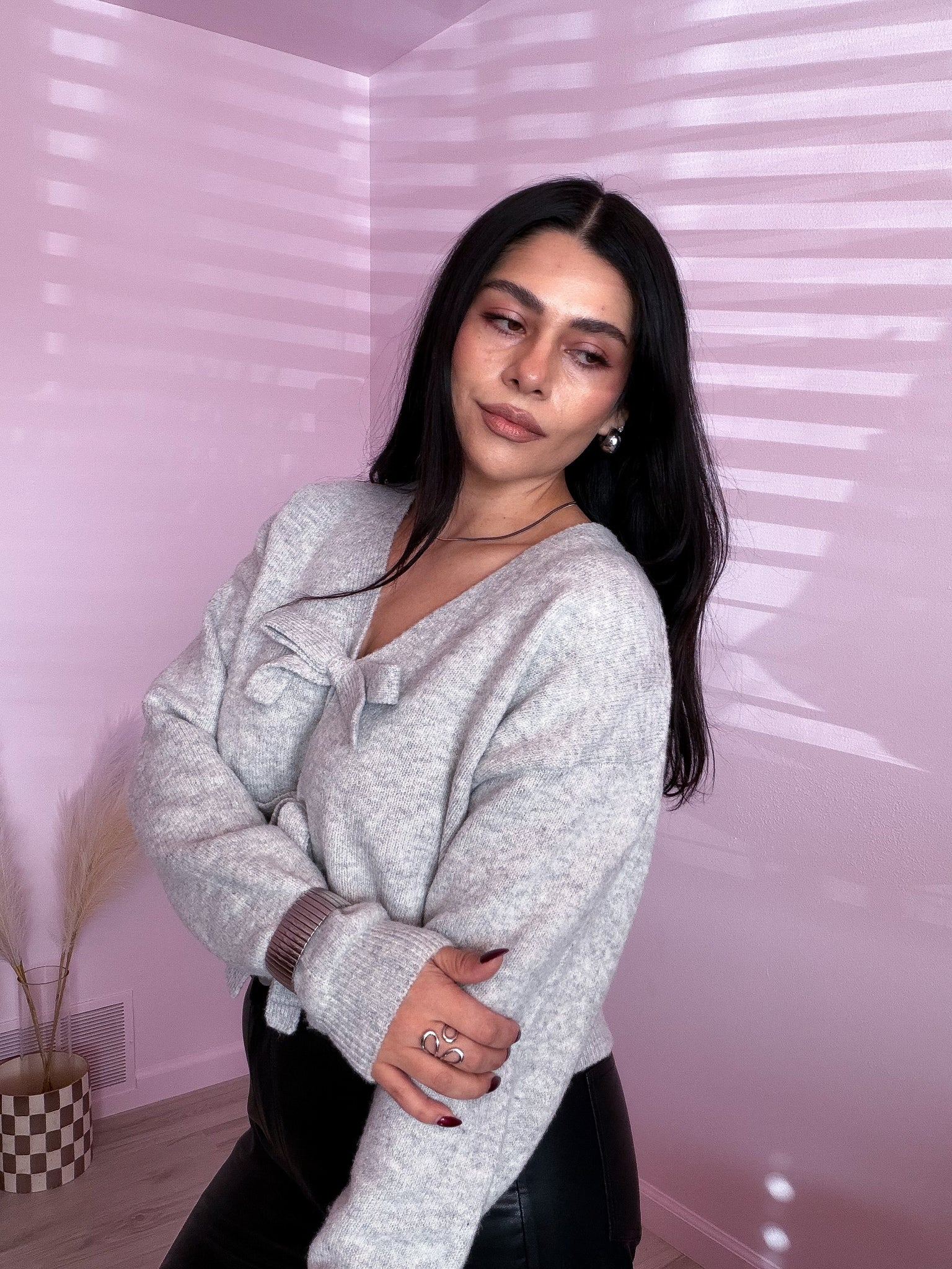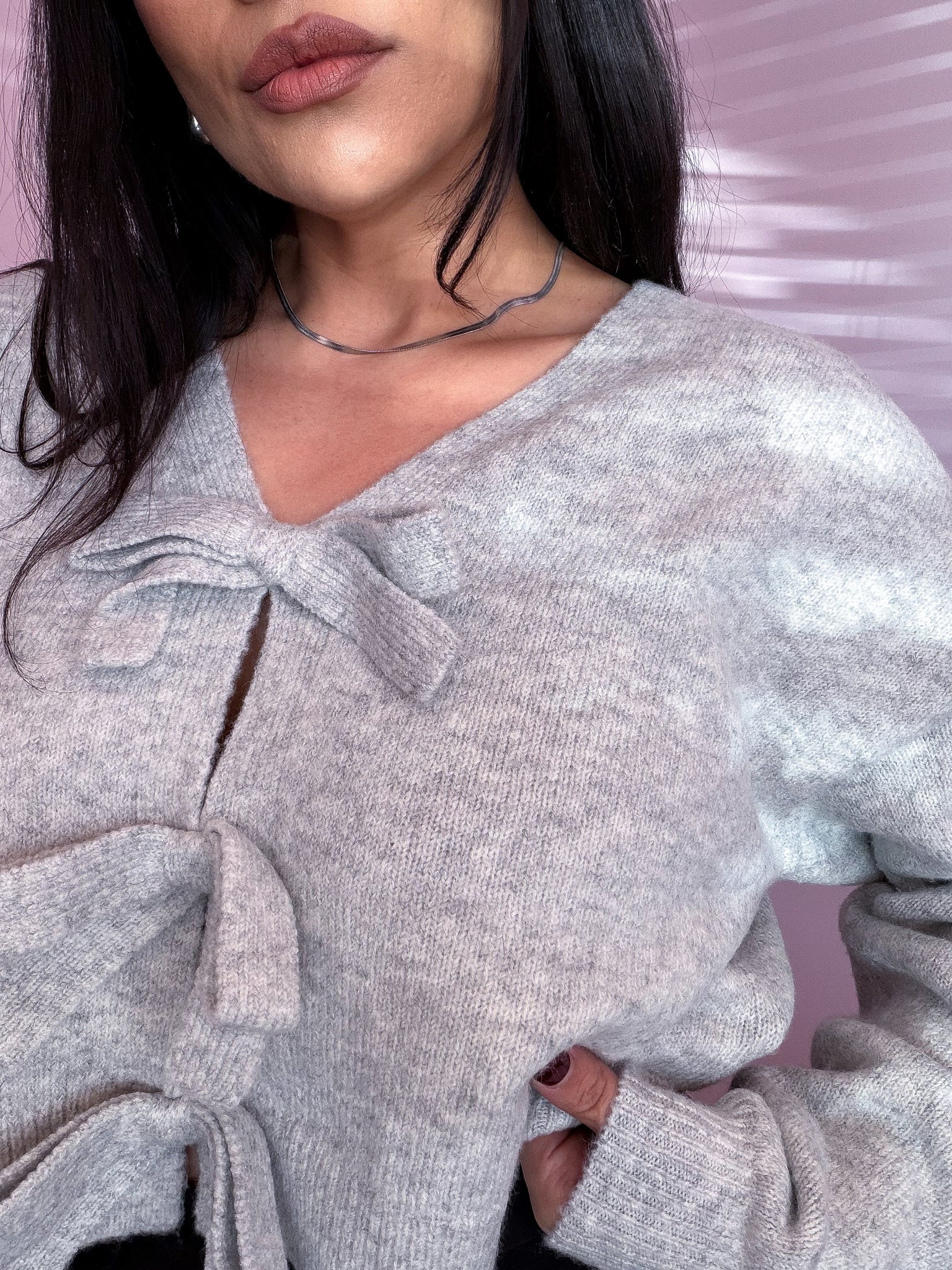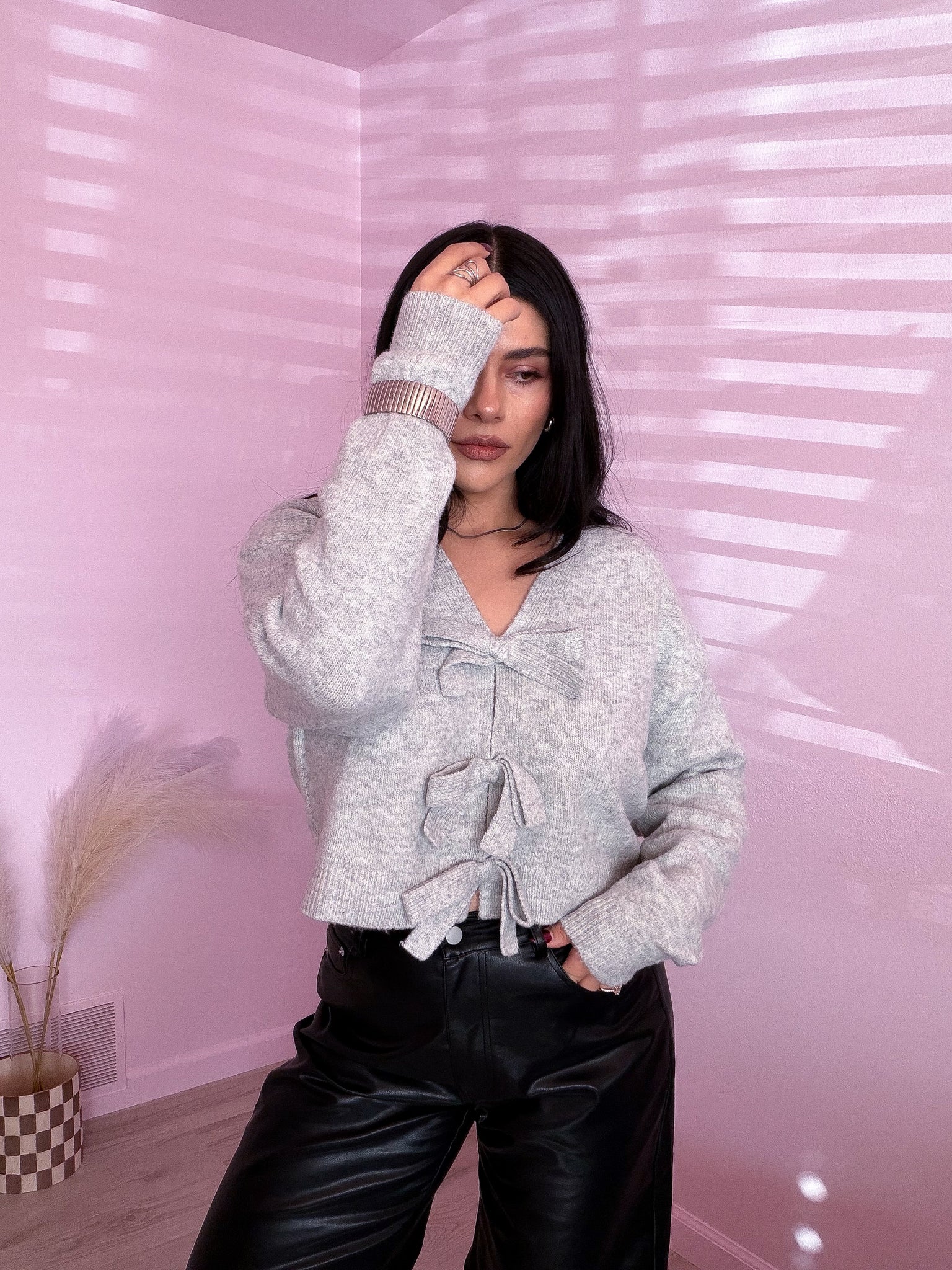 This soft, cropped sweater in heather gray features front bow details, making it versatile enough to dress up or down. Pair it with leather pants, dress pants, a skirt, or jeans for a casual look.
