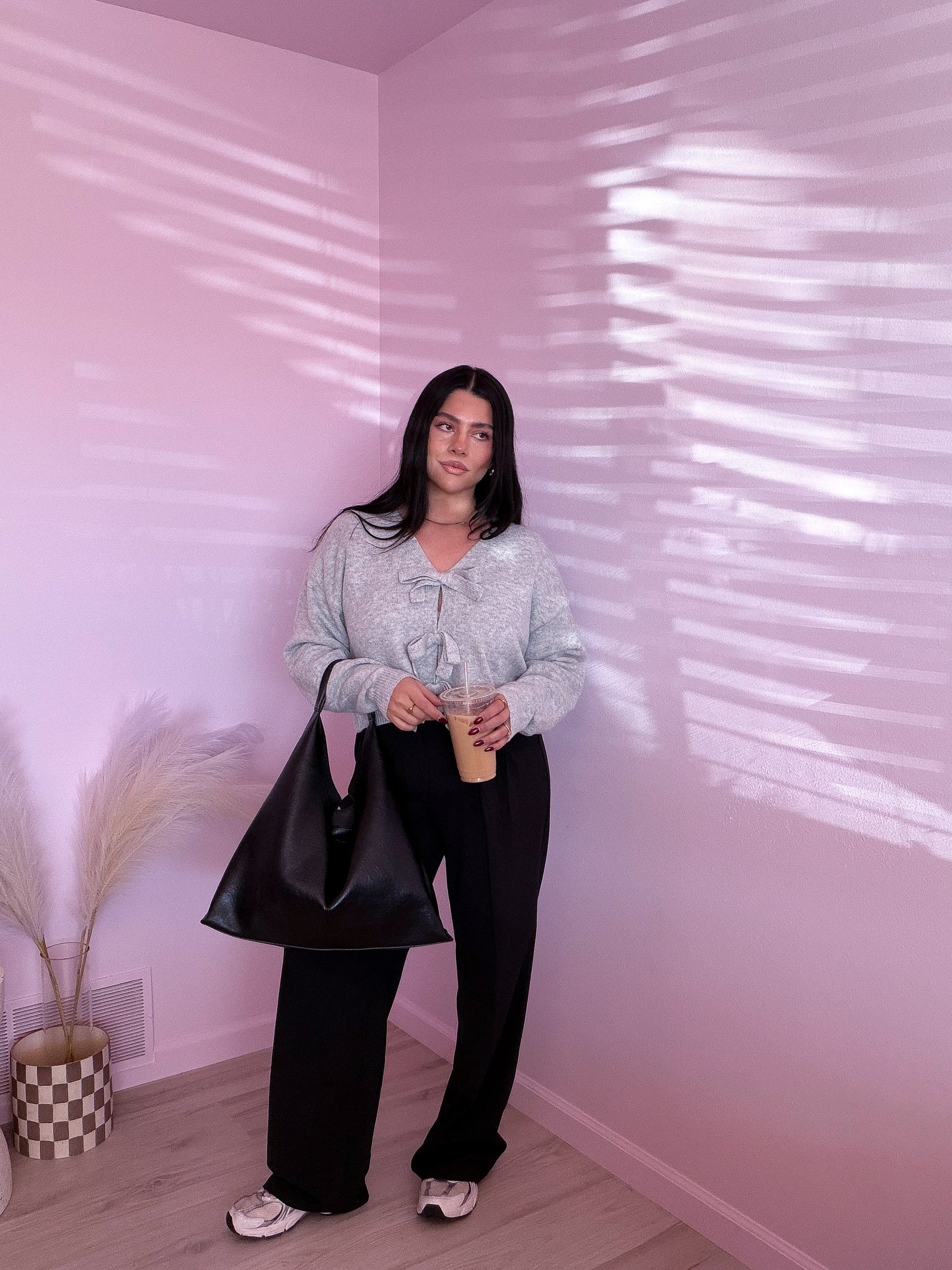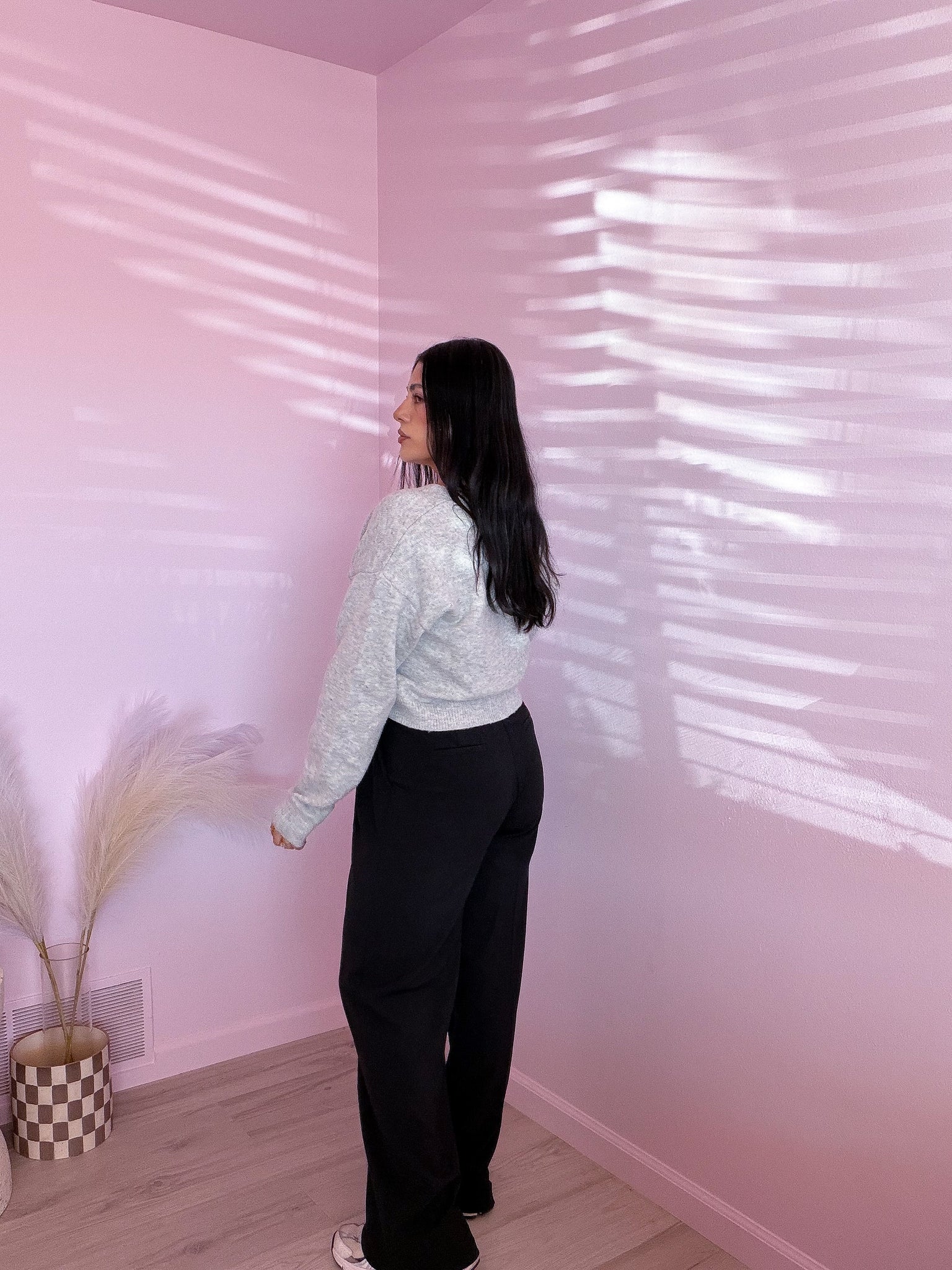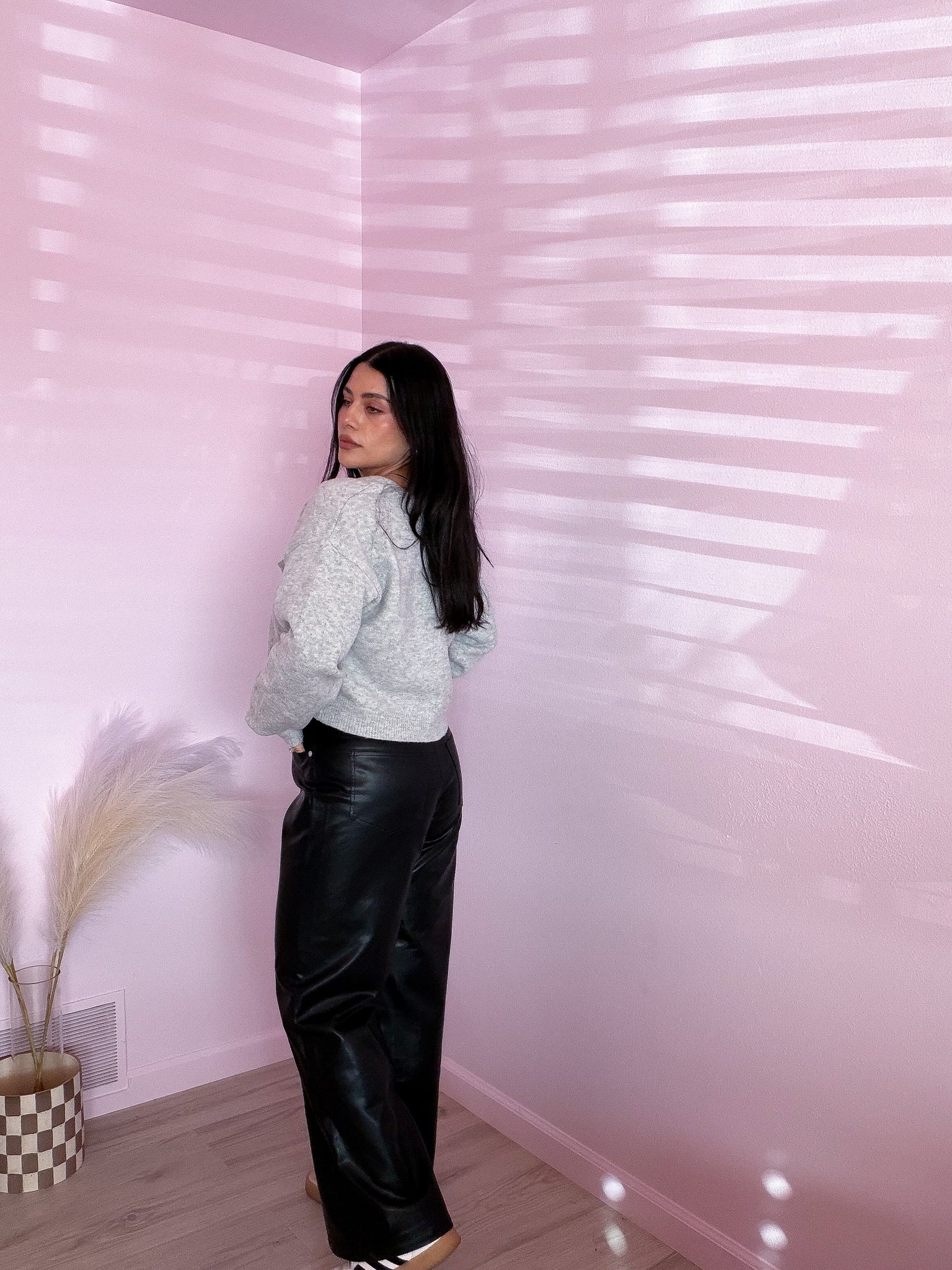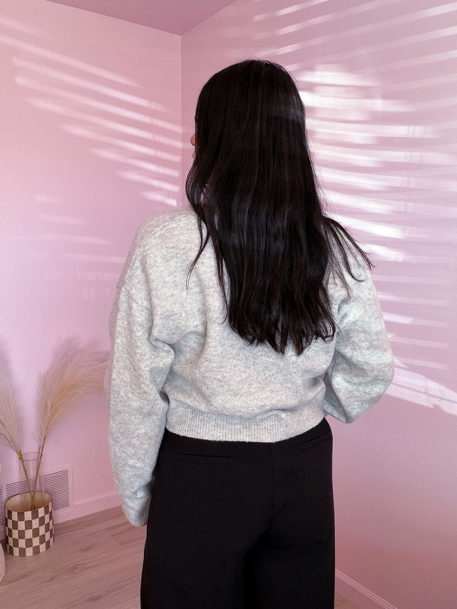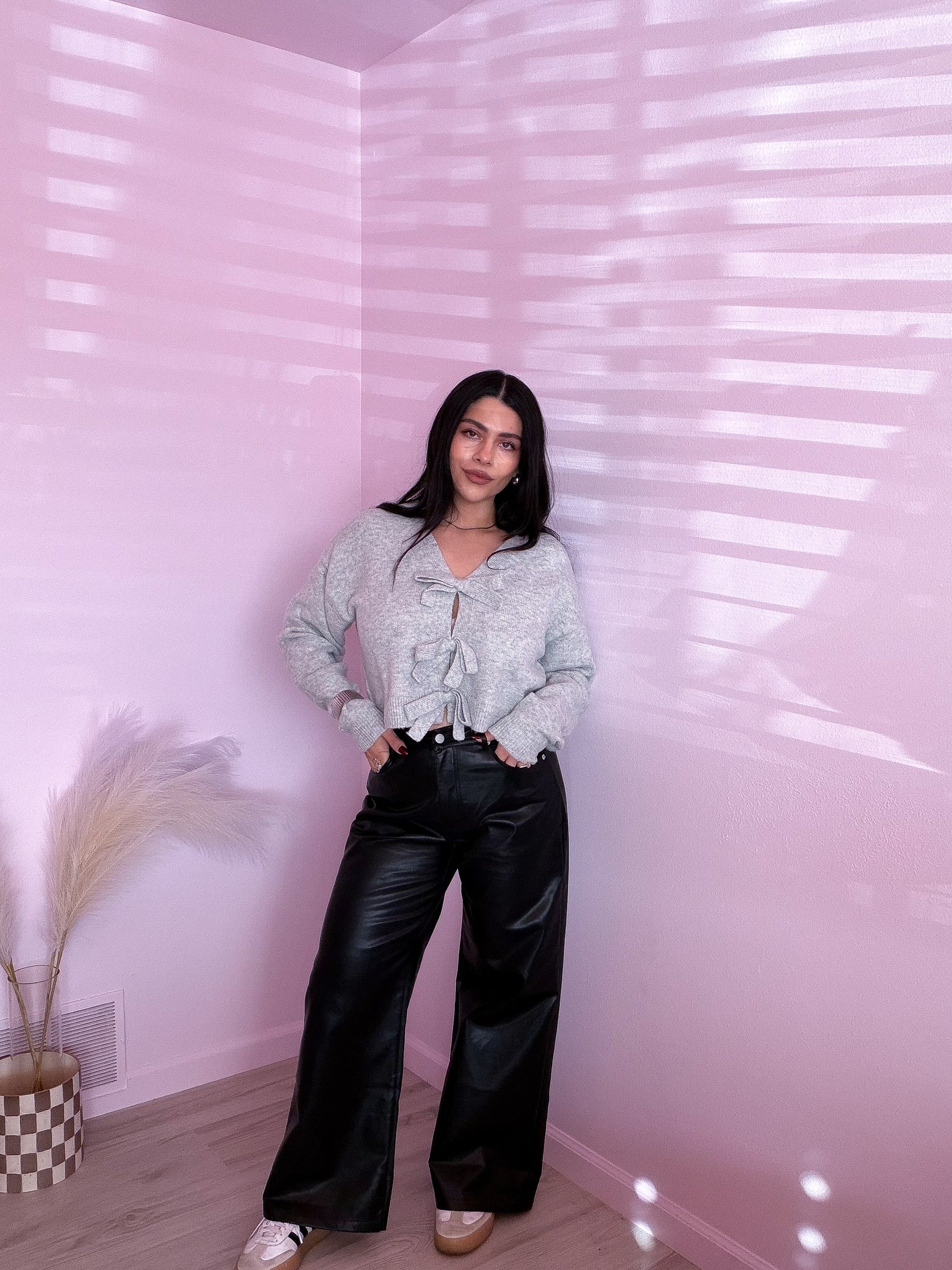 This soft, cropped sweater in heather gray features front bow details, making it versatile enough to dress up or down. Pair it with leather pants, dress pants, a skirt, or jeans for a casual look.