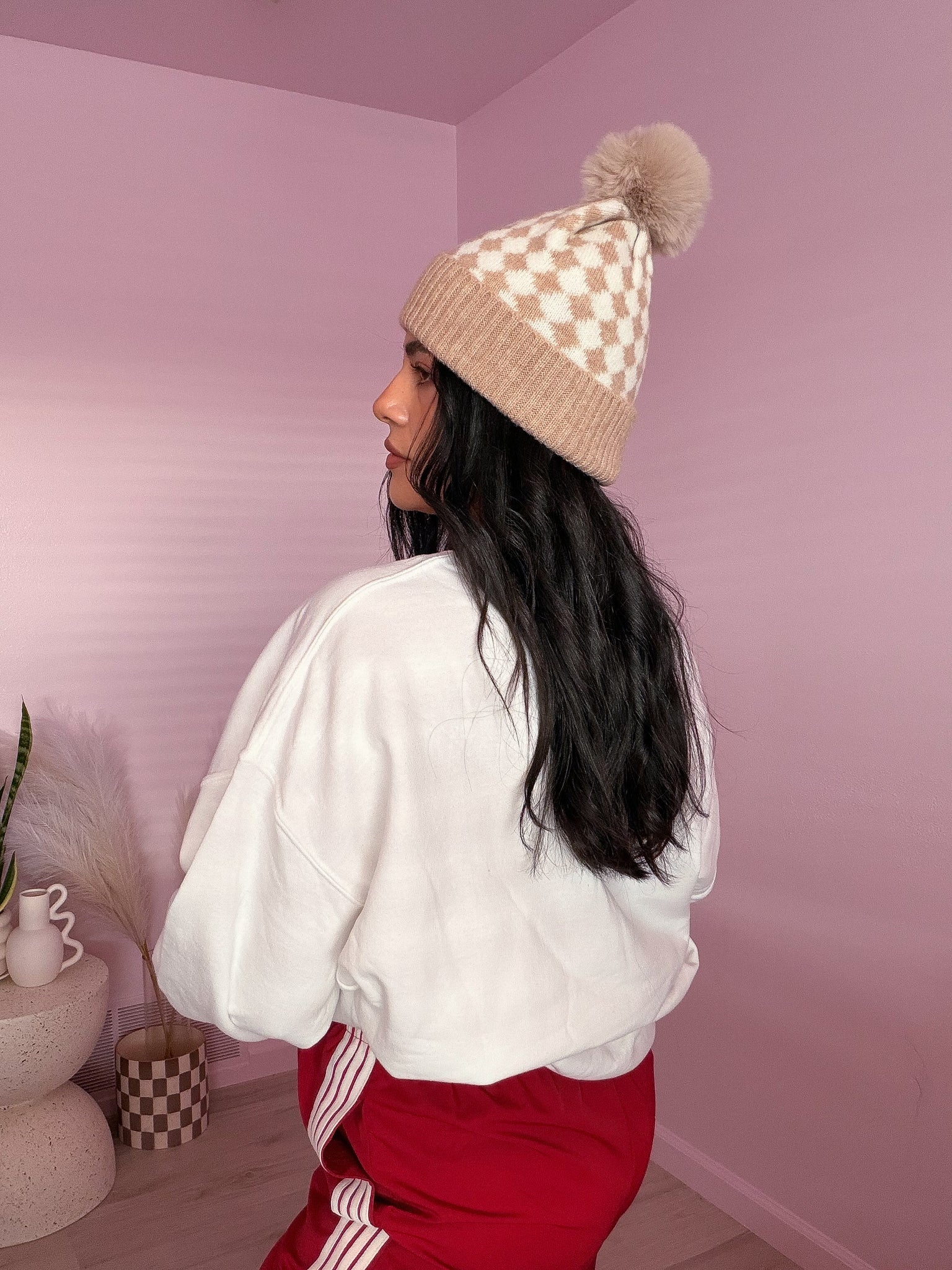 Beige/white checkered pattern colored beanie.