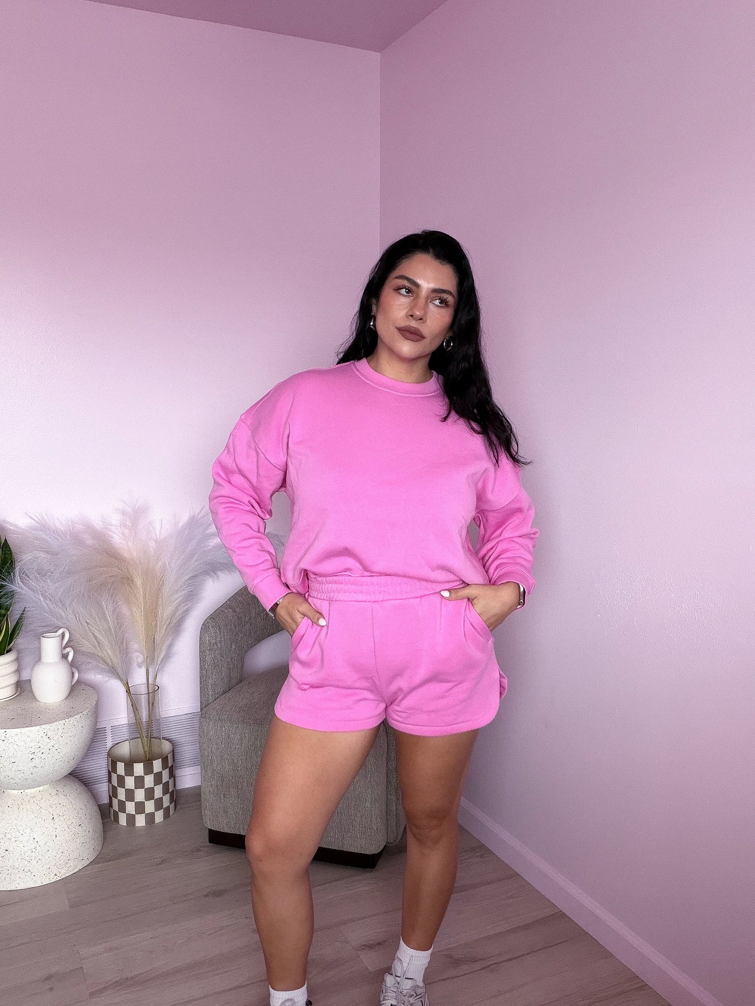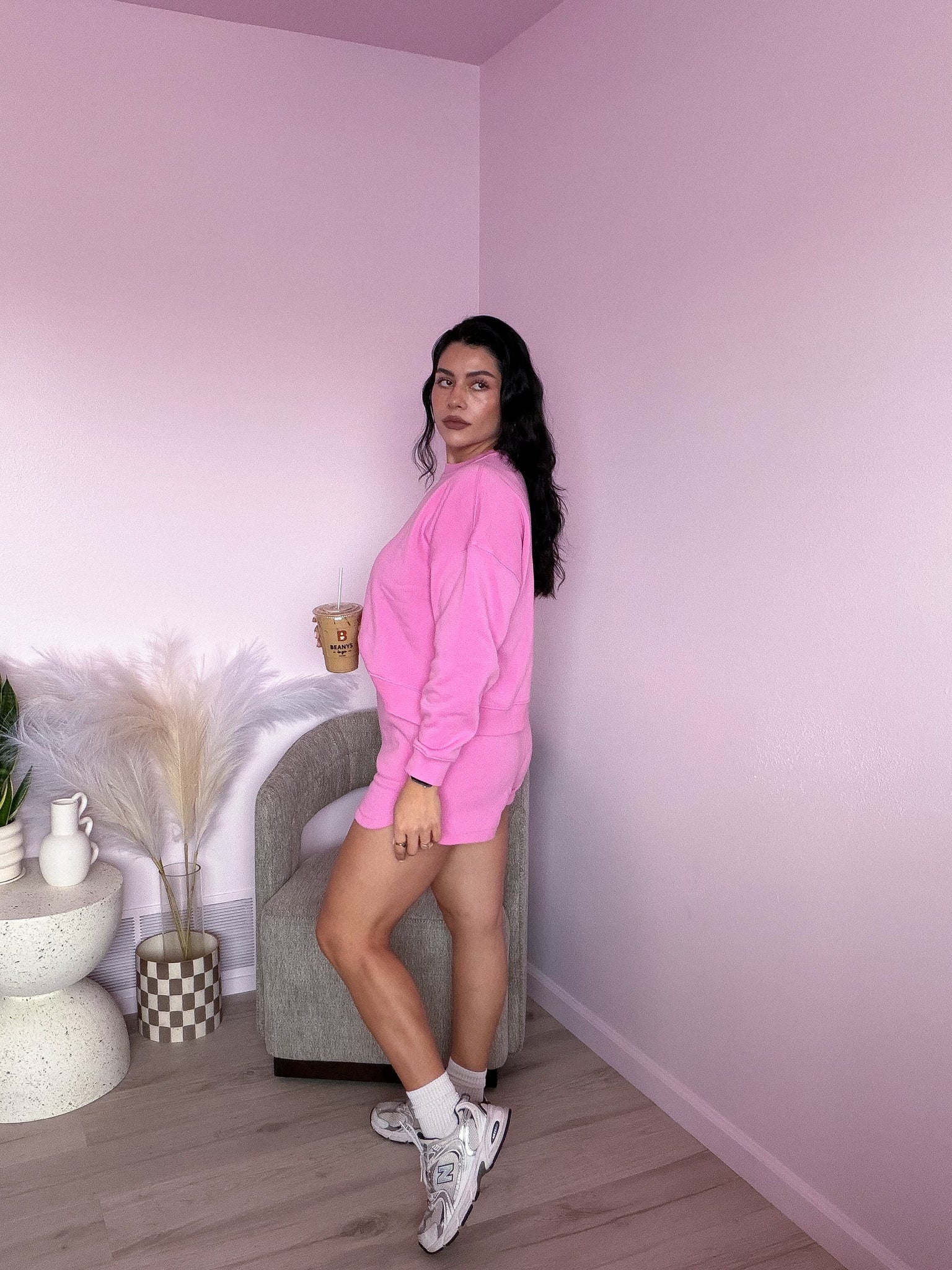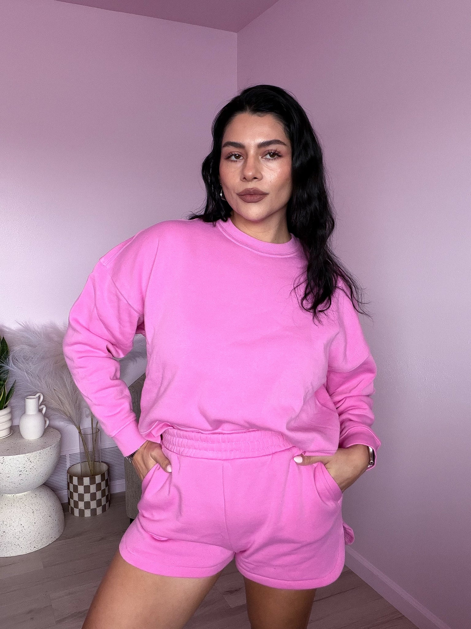 Crewneck sweater has a slight crop and it’s a boxy-loose fit