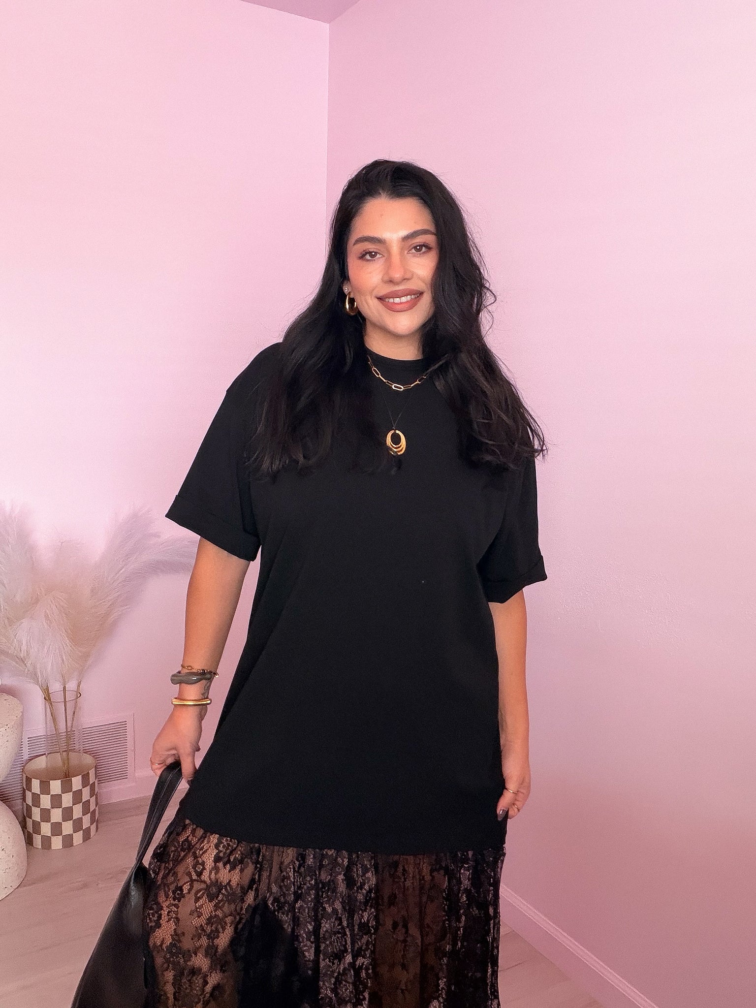 Oversized t-shirt lace maxi dress in black with short rolled up sleeves. It’s unique, comfy & trendy. Pairs well with high boots, dr martens to add some edge, or trainers for a more comfy, stylish look.