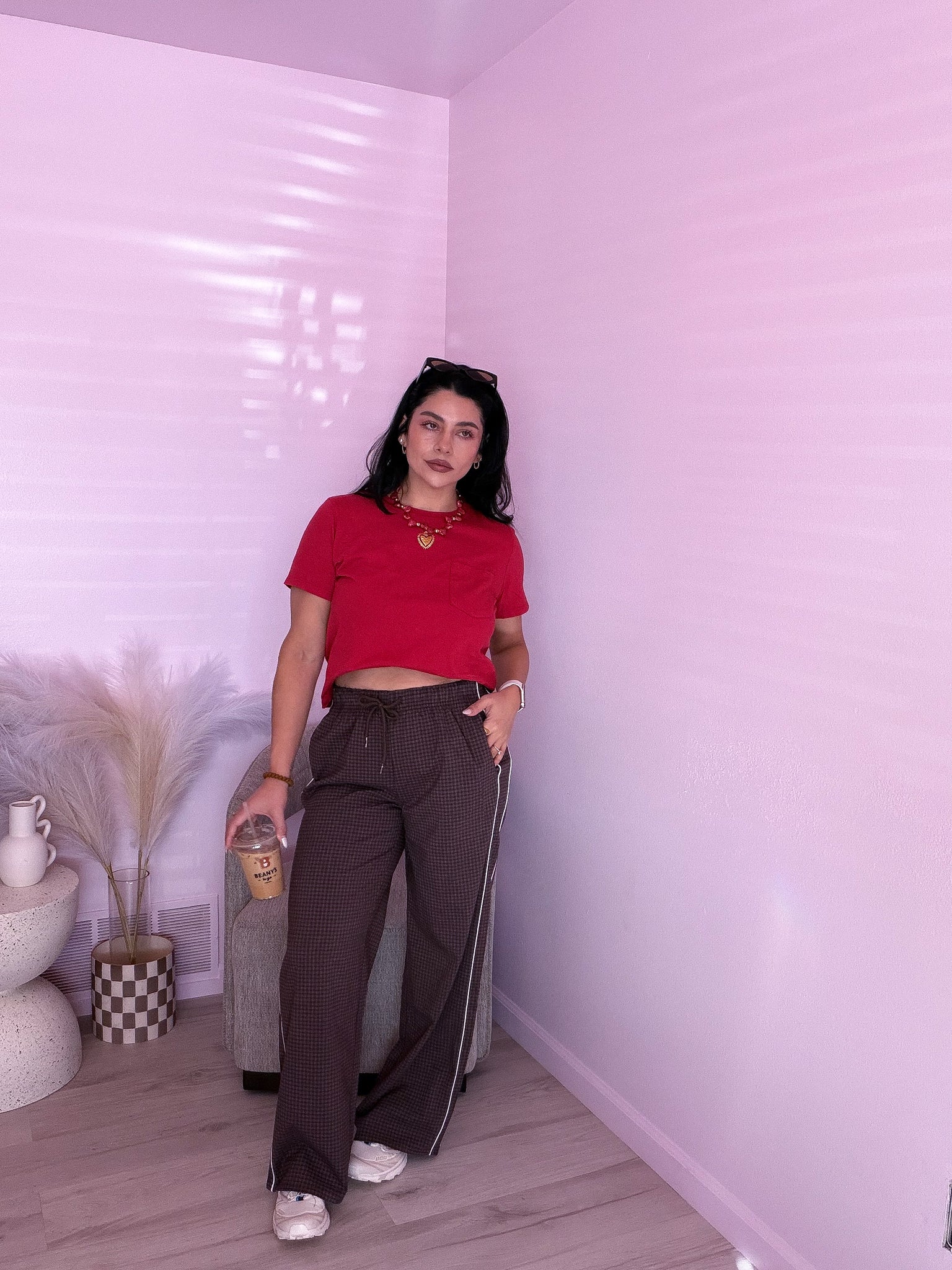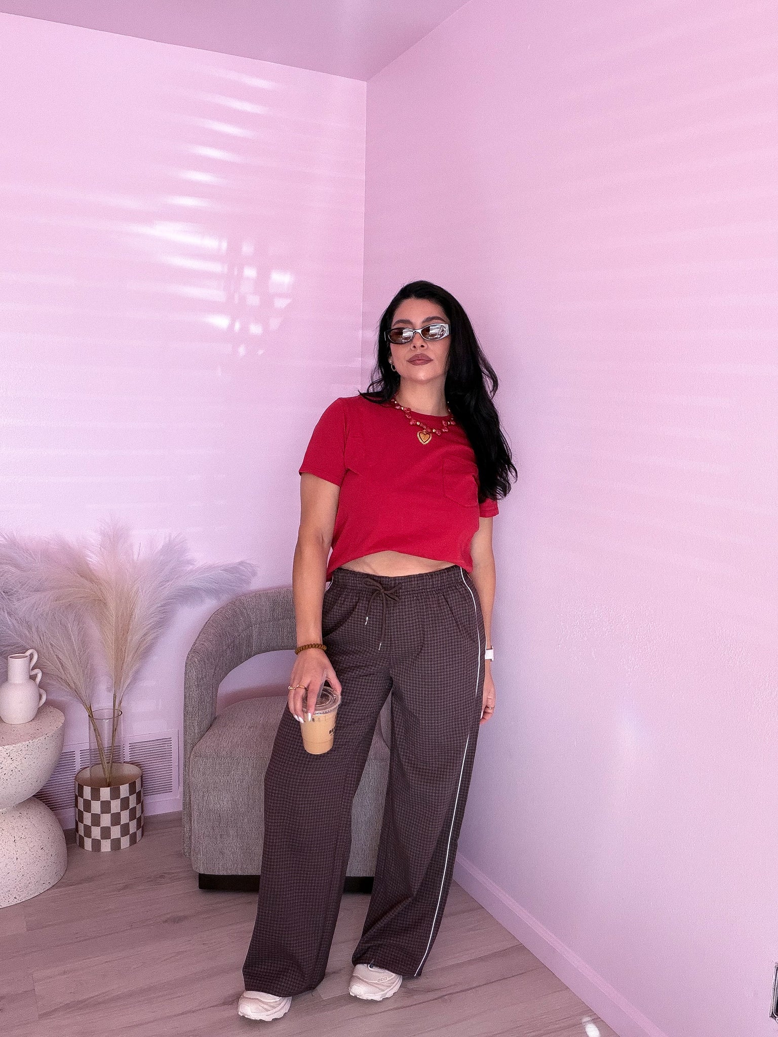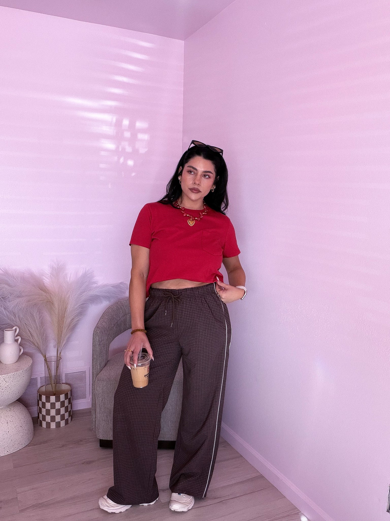 Side-striped woven check pants with elastic waist & front pockets.