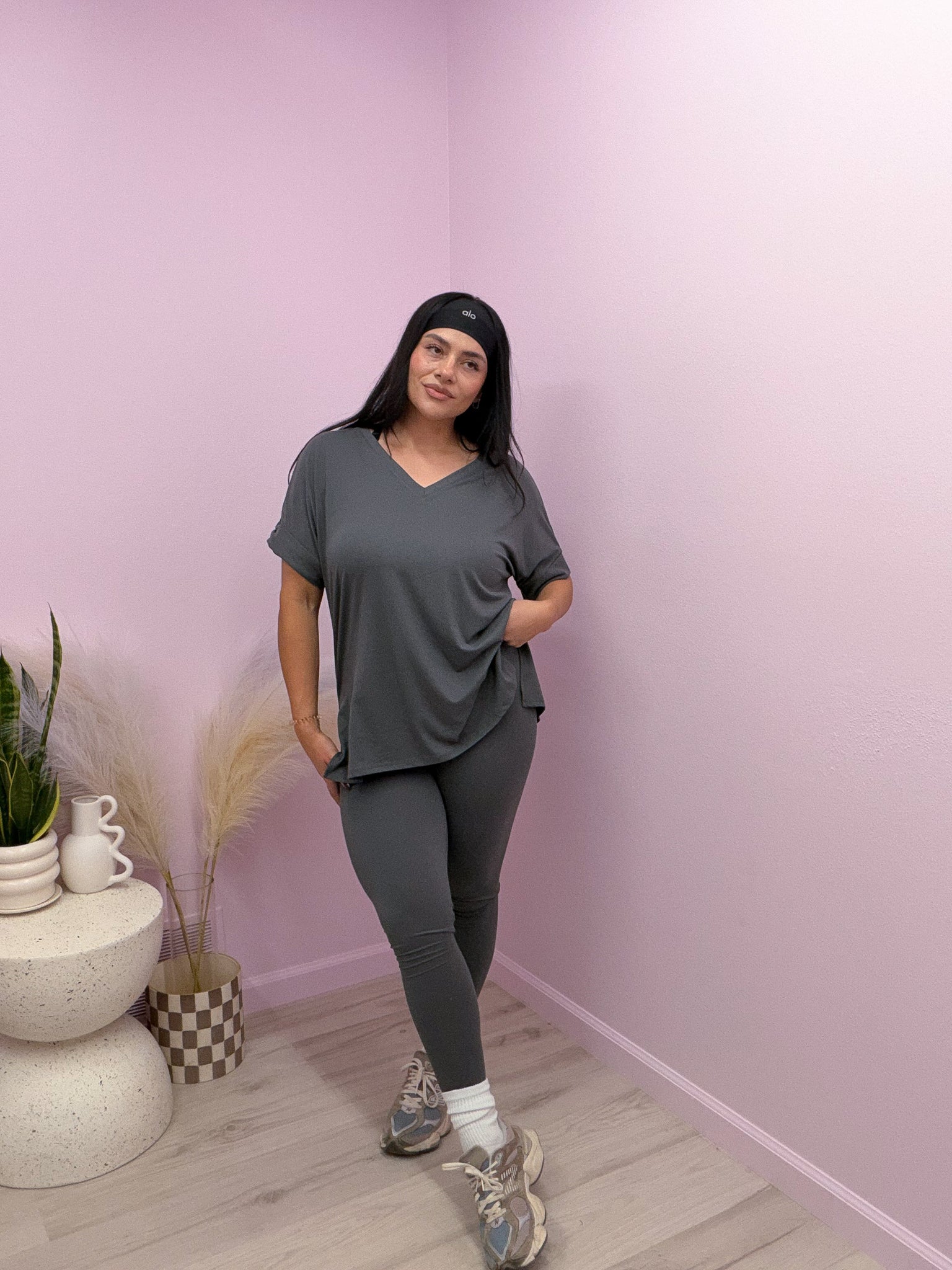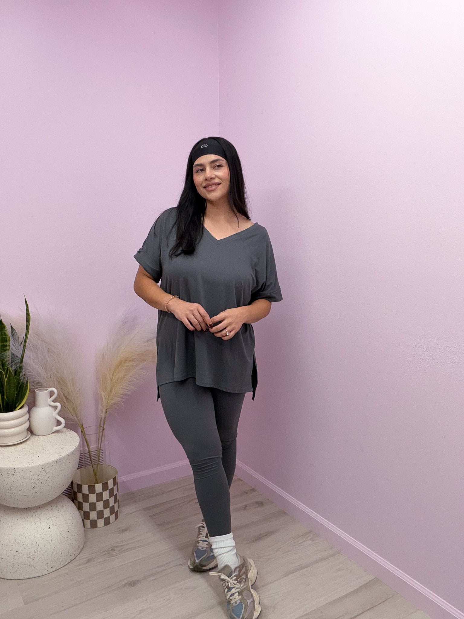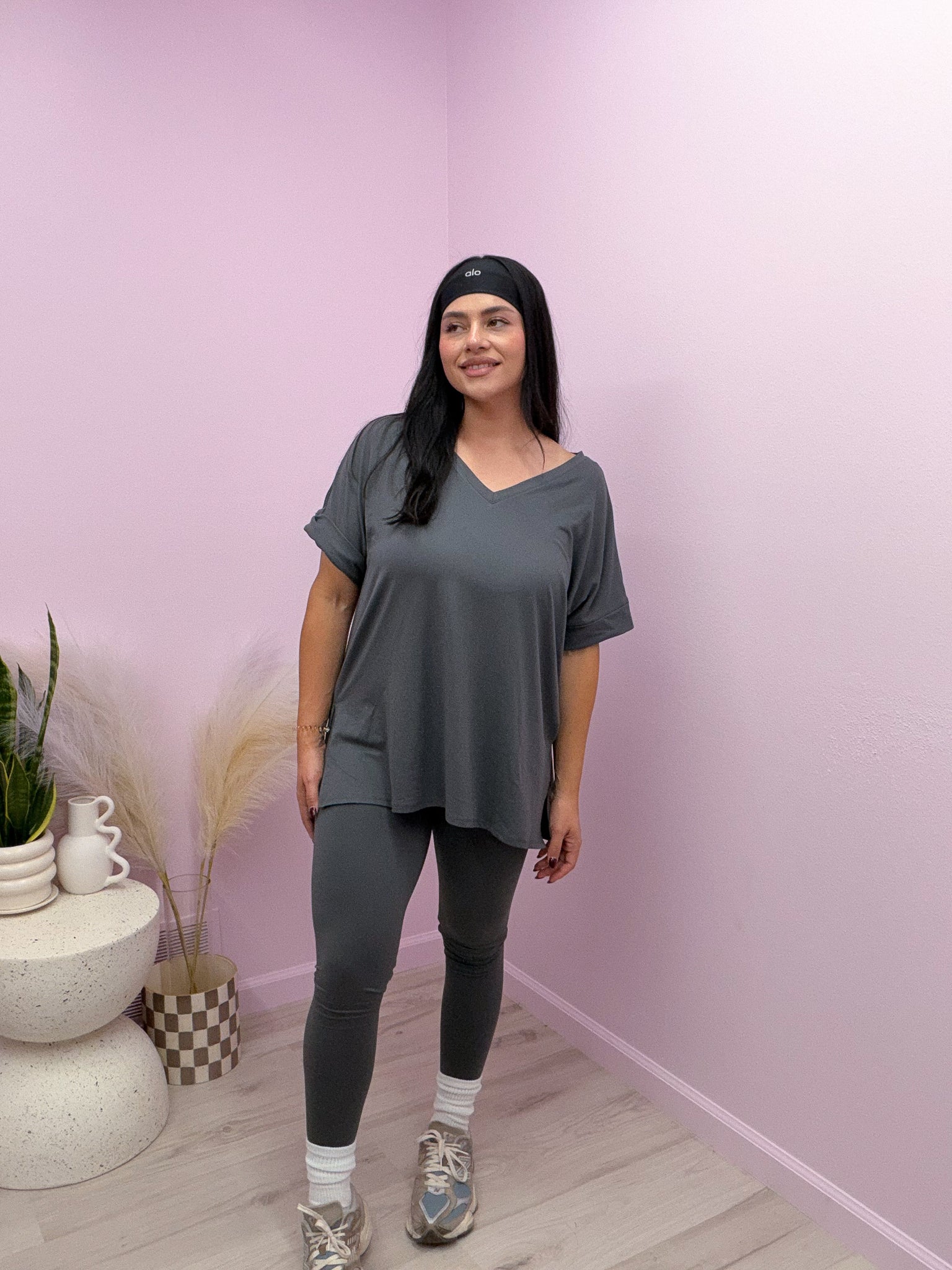 Buttery soft set in ash gray with oversized v neck top & high & low hem. Leggings are high rise with elastic band. Set has high stretch & are true to size!